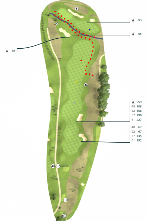 Beachten Sie, dass sich auf der rechten Seite nach dem, den Sie vom Abschlag aus sehen können, ein weiterer Fairwaybunker befindet – ansonsten besteht hier keine Gefahr. Der 2. Schlag sollte meist kurz vor dem Becken platziert werden, aber wenn man wirklich weit gekommen ist, besteht die Möglichkeit des aggressiven Spiels gegen das Grün. Auf dem Loch wurde übrigens schon mal Albatros vermerkt, damit kann man es machen…