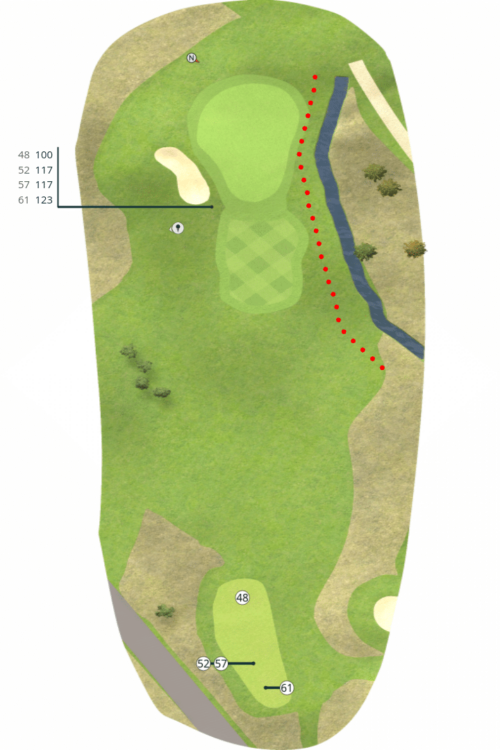 Har kan vinden ofte snyde, og en lille bakke foran og i starten af green betyder at du måske ikke får det rul på bolden du regner med. Afhængigt af hvor flaget er placeret kan det betale sig at ramme venstre side af green på toppen af den lille bakke – for så finder bolden måske retningen mod flaget.